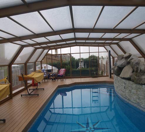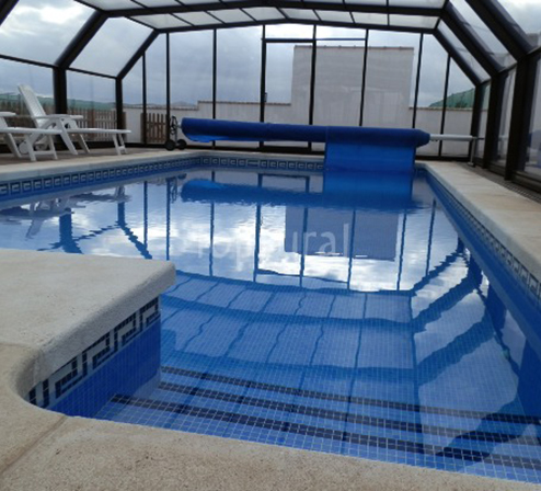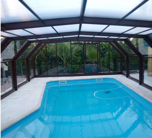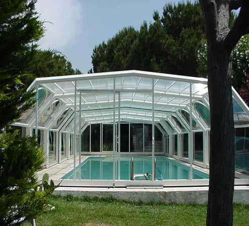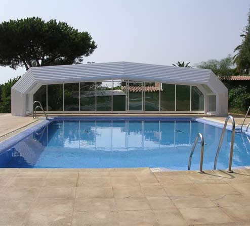 Cubierta poligonal telescópica sin carriles en estructura de aluminio. Con perfil de extrusión y diseño propio.